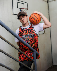El modelo mide 1.78, pesa 65 kg y está usando talla L